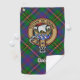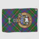 Clan Wood crest badge surrounded by a strap and buckle over tartan background. Custom text.