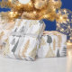 The CLARA holiday wrapping paper features gold and blue tones set on modern Christmas trees