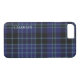 Stylish iPhone7/8 case mate phone case done in a blue and black traditional Scottish tartan plaid of the Clark clan. White text running vertical, on the left side, is ready to personalise. Stylish and great way to protect your smart phone, and makes a great gift idea.