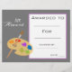 A stylish modern class art award certificate award with cute paintbrush with paint image perfect for encouraging a young art student. You can write in your own details. A great resource for any type of classroom teacher.