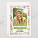Class of 2017 graduation floral border photo announcement. A lovely floral border of flowers in pink and coral with green leaves and a green banner adorn this outstanding invitation for your graduation event.