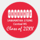 Bright red graduation sticker with white text. Graduate is written in capital letters in a fancy font. The graduate's name and high school is written below in simple and clear white block capital letters. Class of is written in a scrawling modern script wit the graduation year. Attractive envelope seals for graduation invitations and announcements. Also perfect for thank you notes from the graduate.