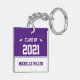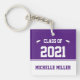 This royal purple and white keychain says 'Class of 2021' and has purple display text for the graduate's name. Two white graduate's caps are near the words 'Class of'.