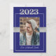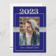 This blue & silver Class of 2023 graduation invitation can be customised to invite to commencement exercises and/or a graduation party in honour of the graduate. This would work well for male or female graduates. The front features a portrait of the graduating student prominently placed with the 'class of 2023' above the photograph and the grad's name beneath. There is also a faux ribbon across the middle behind the picture. The back contains all the information required to attend the festivities. A blue line and the 'class of 2023' are along the bottom edge. This invitation would work well for high school and college/university graduations.