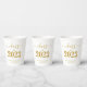 Stylish elegant custom graduation party supply! Celebrate the graduate's accomplishment in style with this trendy graduation party paper cups. Design features  "Class of 2023" in gold font on a clean white background. Personalise this product by adding the name and school name. Easy to customise. Matching graduation party supplies available. Congratulations!