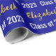 The wrapping paper is dark blue. It has a text pattern for the graduate's name and Class of 2023. The name (Shown: Elizabeth) appears in an elegant faux (not foil) gold script. The other text is white. All of the text can be edited.