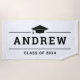 Simply stylish custom graduation beach towel features a minimalist typography design with grad cap and stripe accents. Personalise the bold black modern name text for your graduate and include their class year. White background colour can be changed to match school or graduation party colours. Makes a unique keepsake gift for the grad.