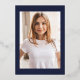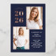 These modern and stylish grad party invitations feature three photos of the graduate, plus their 2024 graduation year in bold, rose gold foil text on a dark navy blue background. Plenty of gold foil accents add an elegant touch to the front of the card.
