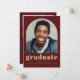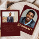 This simple, minimalist graduation announcement features an arch-shaped photo on the front and a horizontal photo on the back. The word "graduate" appears in bold gold-coloured typography, with the graduate's name, school and year in sans serif font on a burgundy background. Add a a more detailed message under the photo on the reverse.