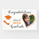 Create a unique white and orange graduation banner for the class of 2025 graduate with a heart-shaped photo, Congratulations saying, and grad's cap and diploma illustrations. Please personalise with the graduate's name and surname, upload a custom photo via template, and change a year before ordering.