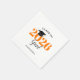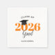 This graduation napkin features a modern design in orange and black and custom text for the name of the graduate. The text reads: Class of 2025 Grad. The design is accented with a black graduation hat.