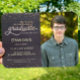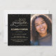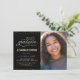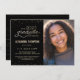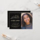 This elegant and festive 4.5" x 6.25" Photo Graduation Party Invitation features gold (simulated foil) confetti with the words "Class of 2025 Graduate" showing in a gold script font. There is a custom photo area for your picture of the graduate. The background is black, but can be changed to any colour of your choice. The celebration details can be easily customised for your special event (such as name of high school). The back of the card features a gold dotted pattern, also with a black background that you can customise to your liking. A beautiful and simple way to invite guests to celebrate a graduation.