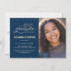 This elegant and festive 4.5" x 6.25" Photo Graduation Party Invitation features gold (simulated foil) confetti with the words "Class of 2025 Graduate" showing in a gold script font. There is a custom photo area for your picture of the graduate. The background is blue, but can be changed to any colour of your choice. The celebration details can be easily customised for your special event (such as name of high school). The back of the card features a gold dotted pattern, also with a blue background that you can customise to your liking. A beautiful and simple way to invite guests to celebrate a graduation.
