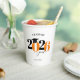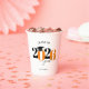 This paper cup features a modern orange and black class of 2025 design. It offers custom text for the name of the graduate or the school name. The design is accented with a black graduation hat.