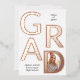 This modern GRAD Class of 2025 graduation announcement features a stunning design with a beautiful rose gold foil. On the front of the announcement, the word 'GRAD' is highlighted in a stunning rose gold foil, along with a photo in the letter D. On the reverse, the announcement is finished off with black and white stripes for a stylish look. This announcement is perfect for any Grad Class of 2024, making it the perfect way to commemorate their special day.