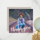 This square graduation thank you card features a custom photo frame that fills the front. Curved text, on the right side, reads: Class of 20XX and can be changed to any year. The back offers custom text for you to add a personal thank you message and your name on a light tan background.