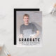 Graduation announcement featuring a custom vertical photo on the front and a smaller horizontal photo on the back. The word "Graduate" appears in bold black typography with a sporty collegiate look ideal for the student athlete, with the graduate's name, school, and year of graduation below in sans serif font. Add details about the graduate's achievements and future plans on the back in white sans serif font on a black background. A good choice for high school or college graduation.