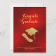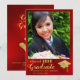 Create a unique red and gold custom graduation announcement with your graduate's photo for the class of 2025. This design is decorated with a graduate cap and diploma illustrations in golden yellow colours. The template makes it easy to personalise the grad announcement with a name, year, school name, photo and other text.