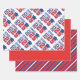 This image showcases a set of three wrapping paper sheets designed for celebrating the graduation of the Class of 2025. The top sheet features a repeating pattern of the text "SENIOR Class of 25" in bold red and blue letters, accompanied by blue graduation caps and diplomas on a white background. The middle sheet is a solid red colour, providing a vibrant and bold option. The bottom sheet displays diagonal stripes in red, white, and blue, creating a dynamic and festive look. This set is perfect for wrapping gifts for graduates, adding a celebratory touch to any present.