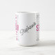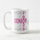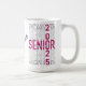 This personalised mug design features the word "SENIOR" repeated multiple times in a bold, black outline font. The numbers "2" and "5" are interspersed within the word "SENIOR" in a vibrant, glittery pink colour. The central "SENIOR" is filled with the same glittery pink pattern, and the phrase "class of" is elegantly scripted across it in white. This design celebrates the graduating class of 2025 with a stylish and eye-catching look, perfect for commemorating this special milestone.