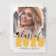Classic Modern Graduation Announcement & Party Invitation. The front features a full-page photo with a white gradient at the bottom that fades seamlessly into the image. Over the gradient, "2025" appears in a bold yellow gold classic school-style font. Just above it, "Class of" is written in elegant black script. To the left of the year is a small, customisable graduation cap icon, which you can change to match your colour scheme. Below the year, the graduate's name and school name are prominently displayed. All colours can be customised to match school colours or personal preferences.
