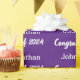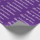 This royal purple wrapping paper has a text template you can edit. You can change the white text to show your graduate's name, the year the student is graduating (shown: Class of 2024), and a custom message (shown: Congratulations). Congratulations and Class of 2024 are in an elegant script, but the graduate's name is not in a script.