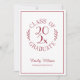 Send elegant graduation invitations for your graduate's celebration featuring a chic burgundy on white typography emblem which reads: CLASS OF [YEAR] GRADUATE with the words curving around the year in the middle with curved botanical leaves along each side of the circular design. Below the emblem is the graduate's name in a maroon script font and their school in a sleek serif font. A fine burgundy rectangle creates a border near the edge.