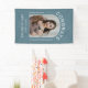 Elegant solid blue and white typography script congrats the graduate graduation party banner with a trendy arch shape photo and modern look.