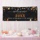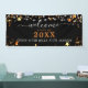 Create a class reunion welcome banner sign in black and orange featuring the title WELCOME in a modern calligraphy script typography, Class Year and name of your school, college or university alumni or other custom text with orange stars and string lights. BANNER OPTIONS: The sample is shown in the 2.5x6' indoor style--other sizes and "outdoor" are available on the ordering page as well as the option of transferring the design to a foam board, poster, tapestry or other product or have the designer convert it to a DIGITAL DOWNLOAD file before personalising for printing locally. ASSISTANCE: For help with design modification/personalisation, colour change, resizing, transferring the design to another product or if you would like coordinating items, contact the designer BEFORE ORDERING via Zazzle Chat or makeitaboutyoustore@gmail.com.
