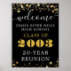 Welcome alumni to their high school or college class reunion (editable for any year) with this elegant black, gold and white poster sign featuring gold stars, string lights, modern calligraphy script typography and personalised with your school name and graduating class year against your choice of background colour (shown in black) you can easily change to a school colour or party theme colour. OPTIONS: The sample is shown in the 22x28" size on Value Paper (Matte). Other sizes and paper options, digital download file for local printing or the option to transfer the design to another product like a foam board, banner, tapestry backdrop, etc. are available on the ordering page. ASSISTANCE: For help with design modification or personalisation, colour change, resizing, transferring the design to another product or you would like coordinating items, contact the designer BEFORE ORDERING via the Zazzle Chat MESSAGE tab below or email makeitaboutyoustore@gmail.com.