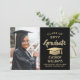 Announce a high school or college graduation and invite family and friends to celebrate with custom photo black and gold party invitations. The picture and wording are simple to personalise and the colours are easy to change with the Zazzle design tool. This downloadable template is set up as a combination announcement card and party invitation that can be customised with any details of your choice, such as parents' names, special honours, degree title, favourite inspirational quote, graduate's future plans or new address. The design features a faux foil mortar board cap, elegant modern calligraphy, classic vintage typography and one favourite photo, such as a senior picture or an image from the commencement ceremony. Please note that gold is printed colour, not metallic foil. This printable graduation card is a stylish way to announce a special day celebration. Congratulations to the graduate!