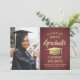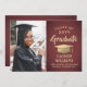 Announce a high school or college graduation and invite family and friends to celebrate with custom photo burgundy and gold party invitations. The picture and wording are simple to personalise and the colours are easy to change with the Zazzle design tool. This downloadable template is set up as a combination announcement card and party invitation that can be customised with any details of your choice, such as parents' names, special honours, degree title, favourite inspirational quote, graduate's future plans or new address. The design features a maroon red ombre background, faux foil mortar board cap, elegant modern calligraphy, classic vintage typography and one favourite photo, such as a senior picture or an image from the commencement ceremony. Please note that gold is printed colour, not metallic foil. This printable graduation card is a stylish way to announce a special day celebration. Congratulations to the graduate!