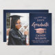 Announce a high school or college graduation and invite family and friends to celebrate with custom photo navy blue and pink party invitations. The picture and wording are simple to personalise and the colours are easy to change with the Zazzle design tool. This downloadable template is set up as a combination announcement card and party invitation that can be customised with any details of your choice, such as parents' names, special honours, degree title, favourite inspirational quote, graduate's future plans or new address. The design features a navy blue ombre background, faux rose gold foil mortar board cap, elegant modern calligraphy, classic vintage typography and one favourite photo, such as a senior picture or an image from the commencement ceremony. Please note that rose gold is printed pink colour, not metallic foil. This printable graduation card is a stylish way to announce a special day celebration. Congratulations to the graduate!