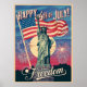 The Statue of Liberty prominently displayed in the centre. A vibrant American flag waving in the background with fireworks bursting around it. "Happy 4th of July!" in bold, vintage-style font at the top, with "Celebrate Freedom" in a smaller, elegant script below. Traditional red, white, and blue with a slightly faded, vintage feel.