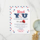 A modern baseball themed baby shower thank you card, featuring a classic white background, trendy navy blue and red typgraphy, a baseball, stars, a helmet with bat and ball and a sporty baby shower thank you template that is easy to customise.