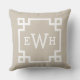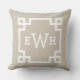 A classic beige throw pillow featuring a customisable three-letter monogram inside a white Greek key geometric border frame. The white-on-beige design creates an earthy, neutral accent that suits any decor style. Personalise with your initials or a couple's monogram for a timeless personalised gift.