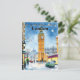 This elegant holiday card features a unique illustration of the famous Big Ben (Elizabeth Tower) surrounded by a lively London street scene in the snow.