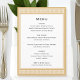 Create your own personalised table menus for a special event. Classic typography and a Greek key border add timeless elegance to your celebration — a geometric, maze-like pattern, inspired by ancient Greek and Roman art. This editable template lets you customise the text to perfectly suit your dishes or courses. Perfect for a formal dinner party, elegant lunch, brunch, birthday, wedding, or other event. Printed colours: gold and white, with dark grey lettering.