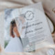 This elegant vellum wedding invitation design features a black script monogram initial encircled by a line art botanical wreath on a white background. The names appear in black script, with the rest of the text in classic serif font. The bottom layer photo card is sold separately in our collection (see below).