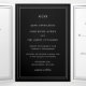 Classic style black trifold wedding invitation featuring a simple and minimal design with your monogram at the top and your event details surrounded by a double border. The fonts alternate between and elegant script, a traditional serif and minimalist sans serif fonts. The left panel is your enlosure card and the right panel is your RSVP postcard. The back has your favourite photo. This all in one trifold invitation is great for a formal wedding.
