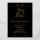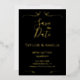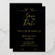 This is a simple, classic wedding save the date invitation card. It is in stylish black and gold with elegant real gold foil script typography. It has the message, "Save the Date", with space for your names, and your wedding date, underneath it says, "We're Getting Married! &