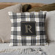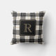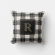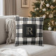 Custom-designed pillow for the holiday seasons featuring personalised family monogram/initial on festive black and brown Tartan/Scottish Plaid pattern.