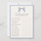 Editable game title and text questions for baby shower or bridal shower. Features a hand painted bow with subtle plaid in Light Blue and ivory background; editable border and background colour on front and back.