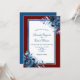 On front: A burgundy background with a simple faux silver, classic blue and white frame. Decorated with flowers, roses in shades of blue. Templates for Your names and wedding details. The names are written with a hand lettered style script, blue coloured letters.