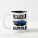 This is a rendering of an American blue classic muscle car with vintage graphics in the background for a retro styled look.