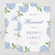 This beautiful design features an all around frame of blue hydrangea blooms and your custom text on the front and back. Punch a hole in the top and add your own ribbon to hang on a chair. Use the template form to add your information.