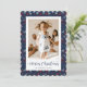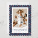 Nostalgic blue, red and white ugly sweater photo Merry Christmas card featuring Santa Claus, reindeer, snowflakes, trees and baubles. Easily personalise this classic holiday card with your photo and family name.