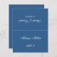 A classic blue wedding place card with the guest name and the table number printed on its front and the bride and groom names and the wedding date printed on the other side (that is the other half, before folding it). All text is white calligraphic script.