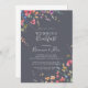 This classic blue wild floral wedding breakfast invitation is perfect for a modern event. The design features a yellow, purple, white wild flowers with foliage in a rose and green watercolor background.