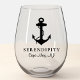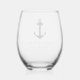 A nautical-themed wine glass for your boat featuring a classic black illustration of an anchor and rope and your boat's name and location in elegant script and typography.